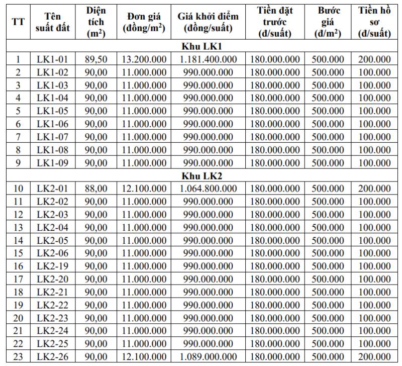 토지 필지의 총 면적은 4 766m2이며 각 필지의 면적은 88~990m2입니다. 시작 가격은 1 100만~8 200만 동/m2이며 필지당 약 9억 9천만 동에서 10억 동 이상에 해당합니다.