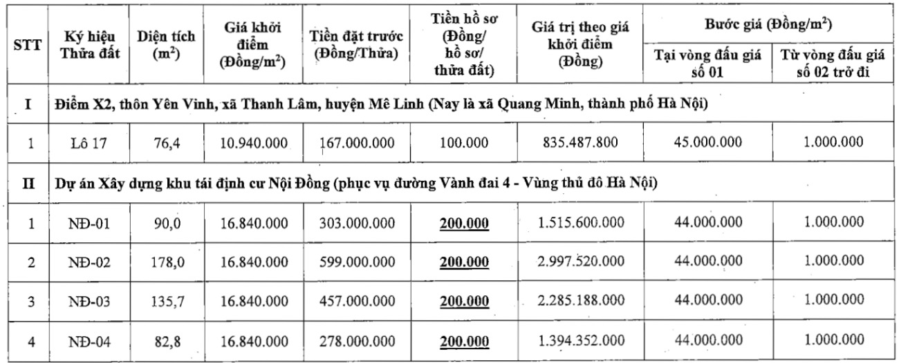 합자 경매 회사 No. 5 - 국가는 최근 옛 메린현 탄람사 옌빈 마을 X2 지점(현재 꽝민사)의 토지 1필지, 노이동 재정착 지역 건설 프로젝트(하노이 수도권 4번 순환 도로 서비스)의 토지 4필지, 정원 및 사무실 프로젝트의 상업용 토지 9필지에 대한 주거용 토지 사용권 경매를 조직한다고 발표했습니다.