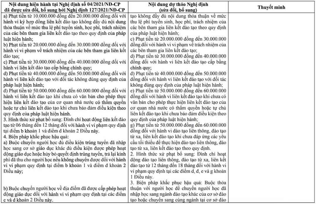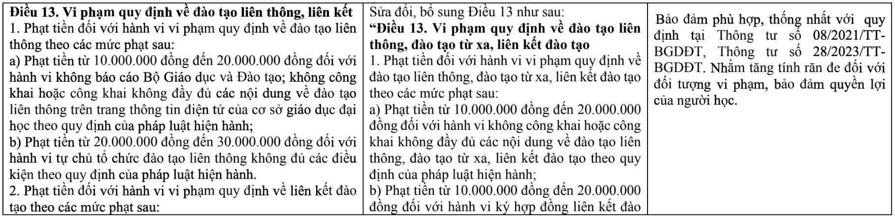 그중 교육훈련부는 연계 교육 원격 교육 연계 교육 규정 위반 행위에 대한 벌금 수준을 수정하고 보충할 것을 제안합니다. 이에 따라 교육훈련부 법령 초안 제11조 교육훈련부는 수정할 것을 제안하고 제13조를 보충합니다. 교육훈련부는 이 조항이 통지서 제08/2021/TTBGDDT호 통지서 제28/2023/TTBGDDT호 규정과 일치하도록 보장한다고 밝혔습니다. 이를 통해 위반 대상에 대한 억제력을 높이고 범죄자의 권리를 보장합니다.