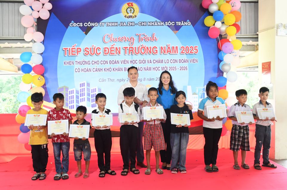 Can Tho - 8월 20일 Jia Zhi Co. Ltd. - Soc Trang 지점 노동조합은 노동조합원 및 노동자 자녀를 위한 학교 가는 길 응원 프로그램을 조직했습니다.