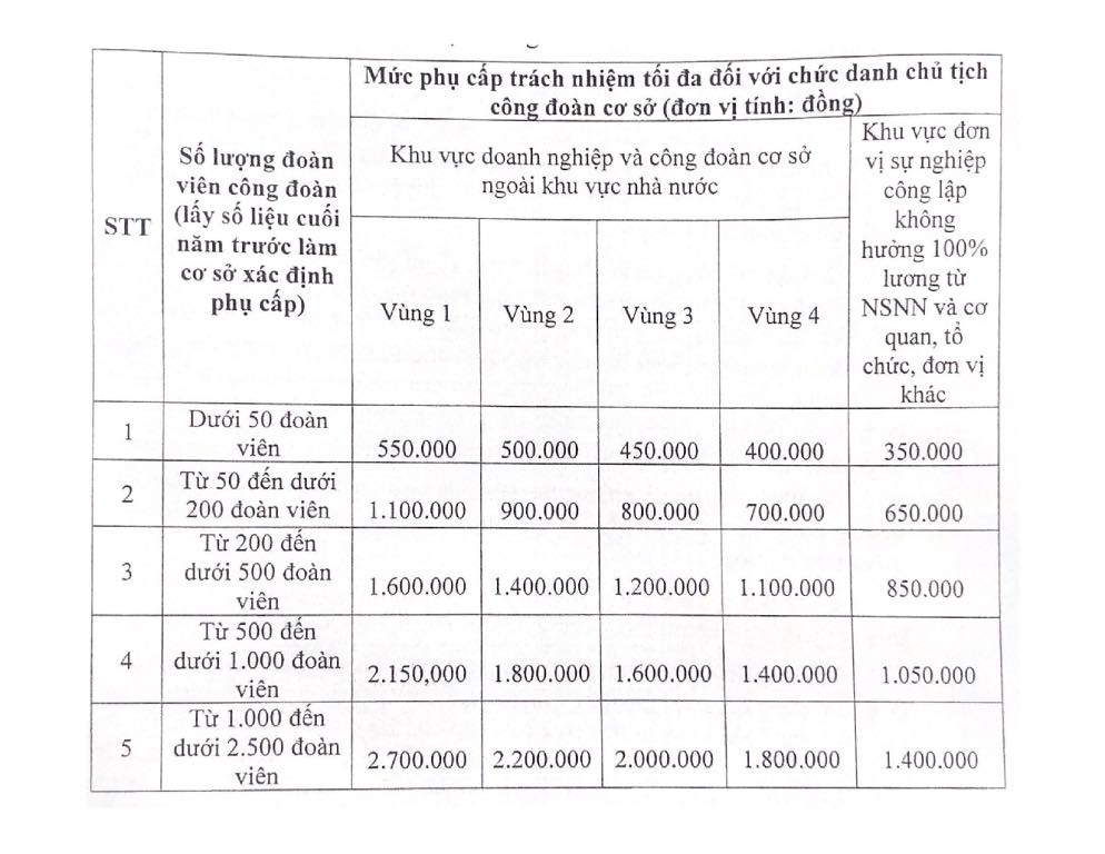 결정에 첨부된 각급 노동조합 간부 수당 제도 규정에 따르면 2026년 1월 1일부터 기초 노동조합 위원장 직책에 대한 최대 책임 수당 수준은 다음과 같습니다.