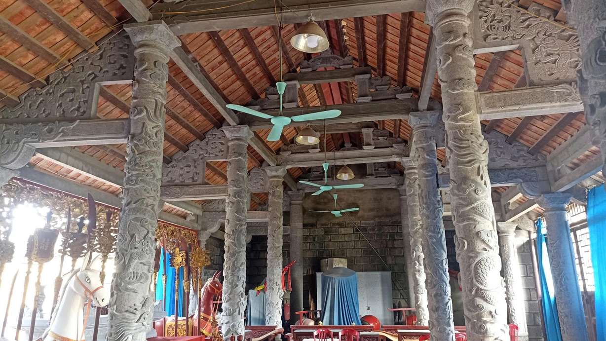 사당의 전당은 3칸으로 되어 있으며, 내부에는 섬세하게 조각된 돌로 만든 기둥과 군사 기둥이 서로 매우 단단하게 연결되어 있습니다. 기둥은 용으로 조각되었고, 작은 기둥은 풀, 나무, 꽃, 새, 특히 봄, 여름, 가을, 겨울의 4가지 계절을 대표하는 4그루의 소나무, 국화, 대나무, 매화로 조각되었습니다.