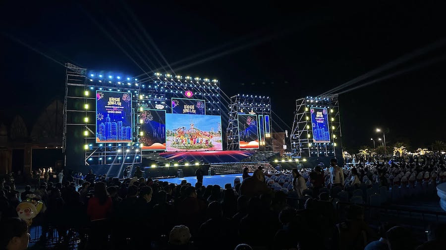 불꽃놀이 시간 전에 VinWonders Cua Hoi에서 열리는 새해맞이 예술 프로그램은 가수, DJ, 래퍼, 무용단, Nghe An 전통 예술 센터 예술가들이 참여하는 대규모 무대로 구성되었습니다.