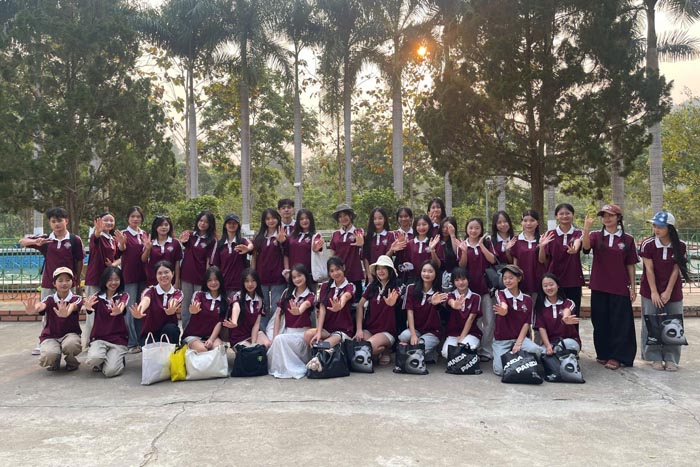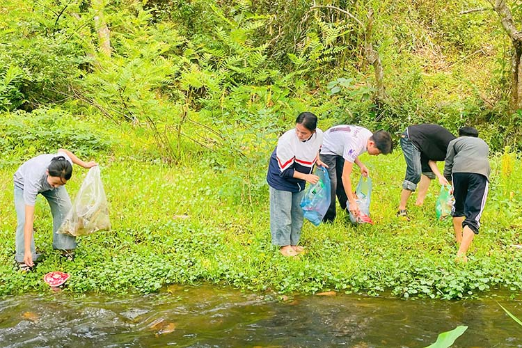 마을에 도착했을 때 학생들은 작은 그룹으로 나뉘어 주변 지역의 쓰레기를 수거했습니다. 이것은 작은 행동이지만 관광 경관을 깨끗하게 하는 데 기여하고 환경 보호 메시지를 직접적으로 전파합니다.
