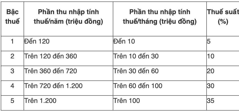 최저 세율은 월 1천만 동 이하의 소득에 적용되는 5%입니다. 최고 세율은 현재의 8천만 동 대신 1억 동 초과 소득에 대해 여전히 35%입니다.