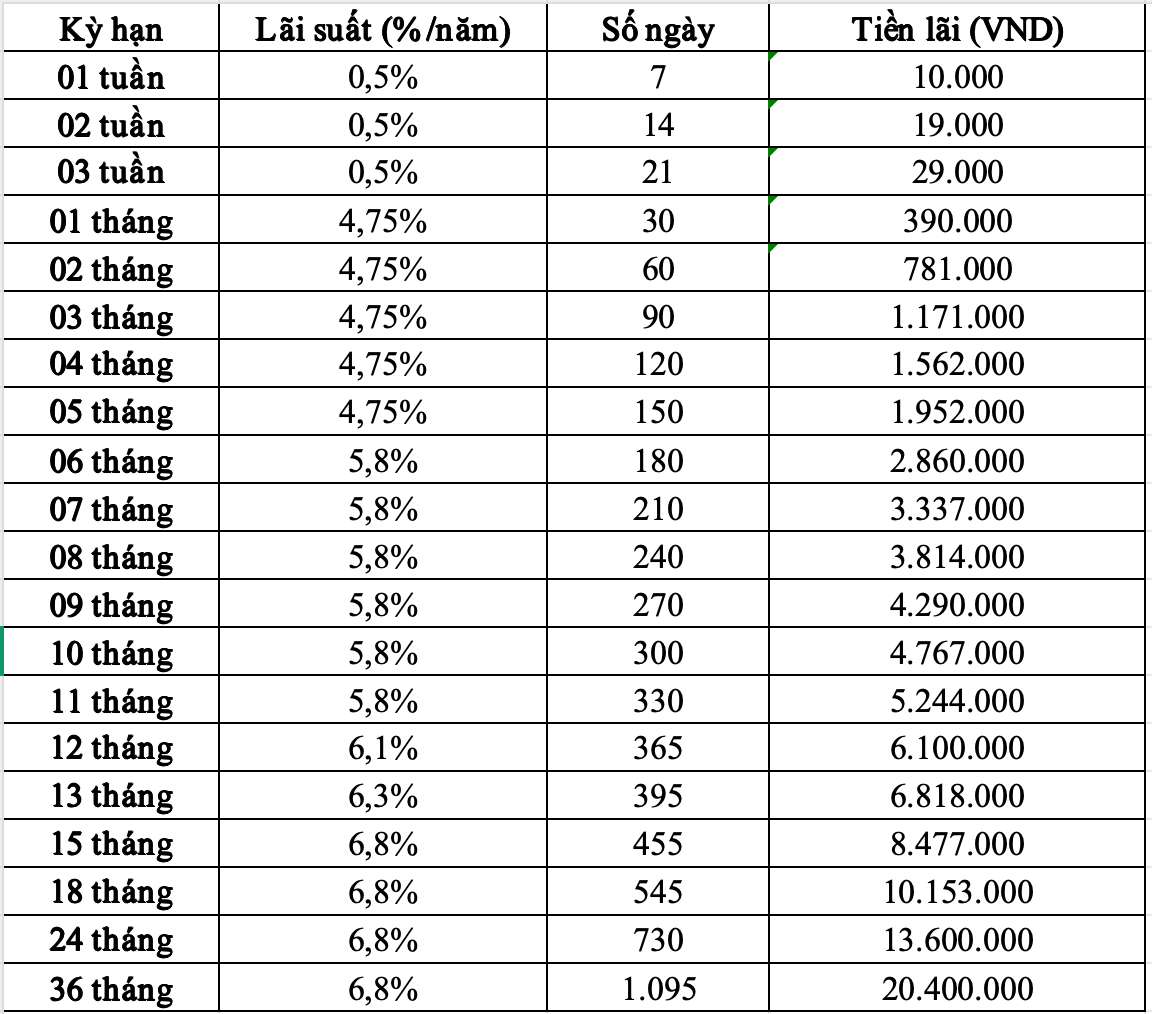 따라서 PVCombank에 1억 동을 예금하면 고객은 다음과 같이 가장 높은 이자를 받을 수 있습니다.