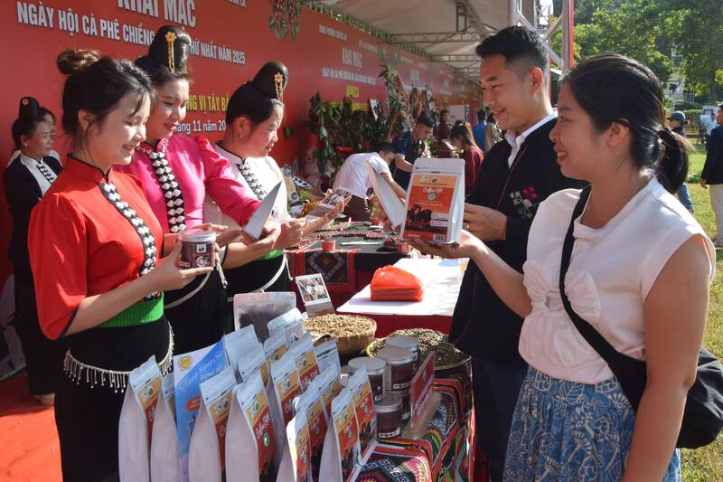 Vien 부스에서는 Phieng Tam 종합 농업 협동조합이 많은 방문객을 끌어들입니다. 협동조합 이사인 Ca Van Danh dat 씨는 '저희는 관광객들이 Chieng An 커피의 풍미를 완전히 느낄 수 있도록 쌀 커피 특선 생두 커피를 현장에서 직접 만들어 맛볼 수 있도록 제공합니다.'라고 말했습니다.