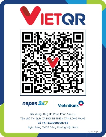 모든 도움은 다음 주소로 보내주십시오: Quy XHTT Tam long Vang ngai so 51 Hang Bo, Hoan Kiem, Ha Noi. 전화: 024.39232756. 계좌 번호 (STK): 113000000758 tai Vietinbank Chi nhanh Hoan Kiem boi Ha Noi. STK: 0021000303088 - tai Vietcombank - Chi nhanh Ha Noi, STK: 12410001122556 - tai BIDV - Chi nhanh Hoan Kiem. 또는 다음 QR 코드를 스캔하십시오:
