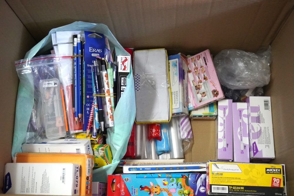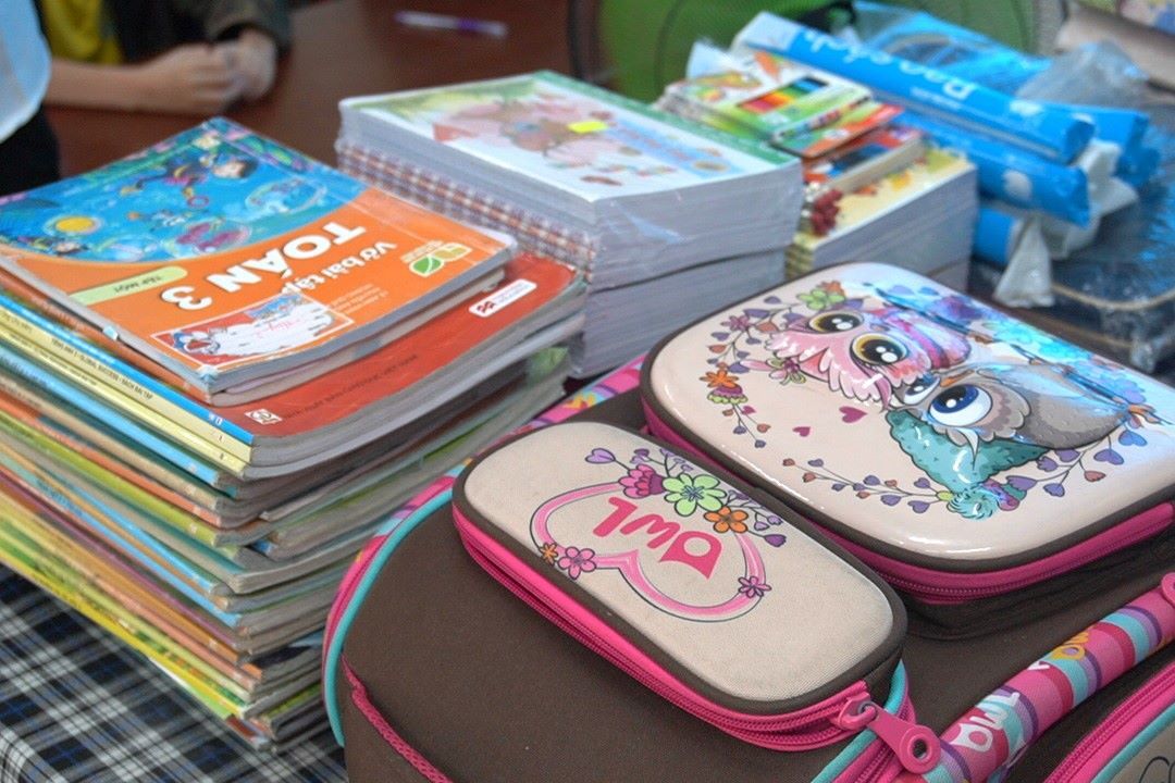 다낭에서 책과 학용품을 기증하는 사진: