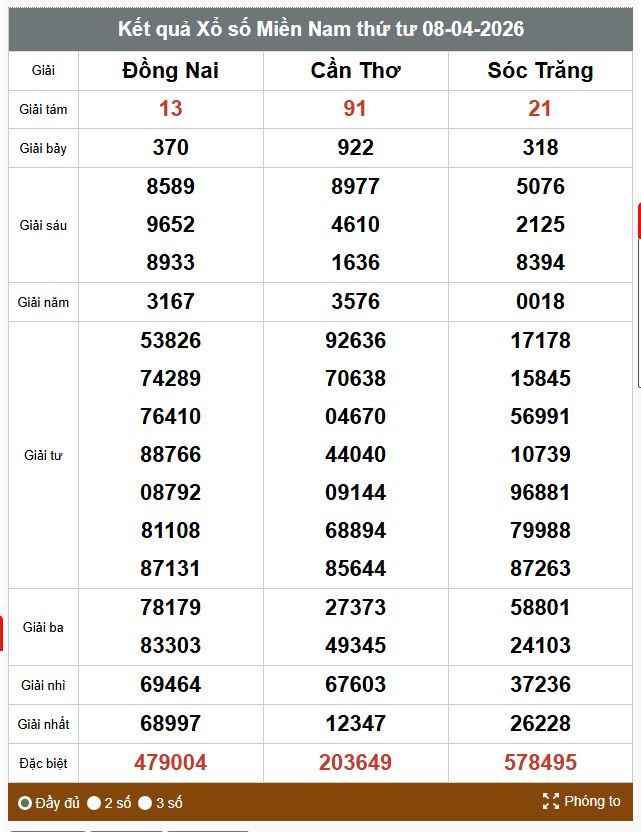 오늘 4월 8일 남부 복권(XSMN) 결과는 동나이, 껀터, 속짱 복권 회사에서 발표했습니다.