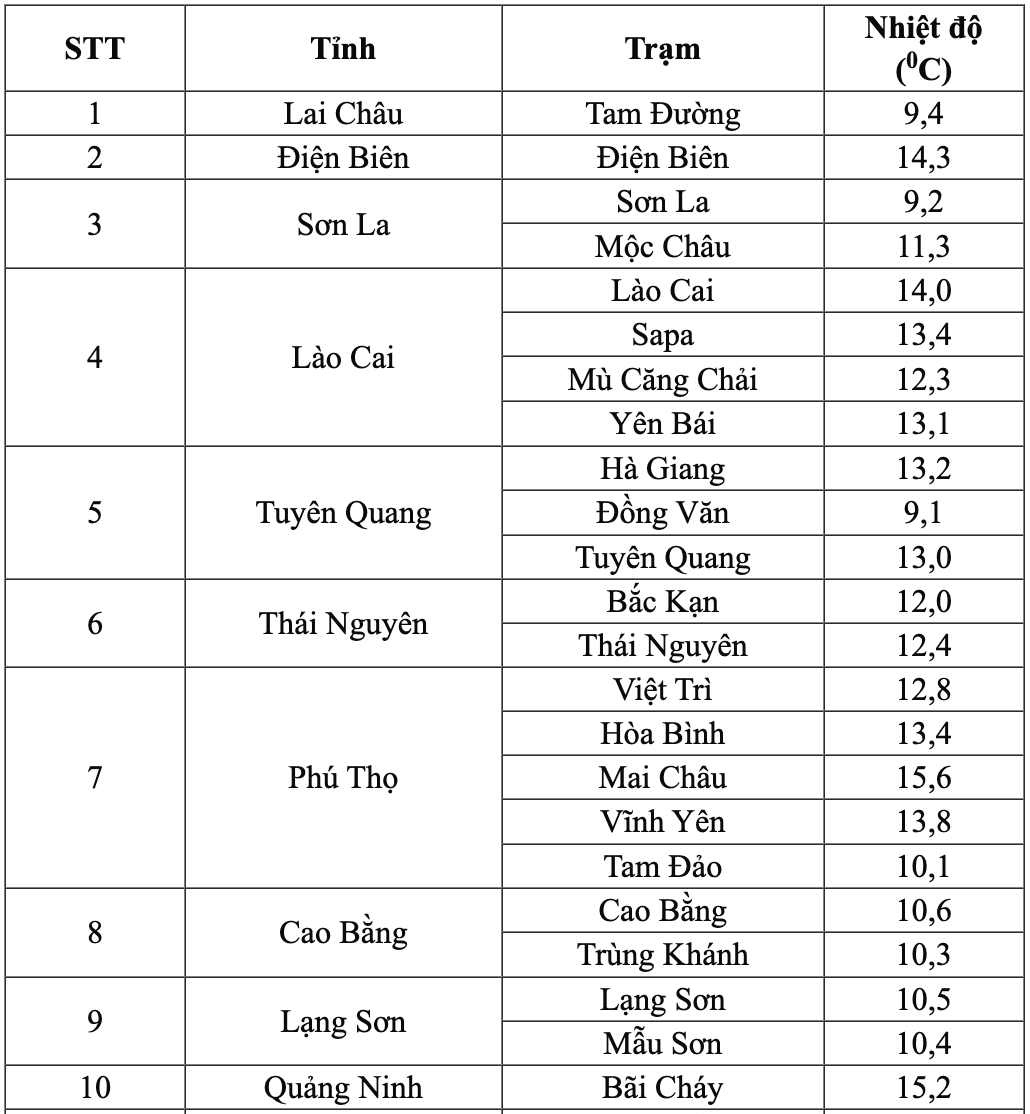 북부 중부 및 평야 지역은 일반적으로 12~14°C이며, 하동(하노이) 13.8°C, 박닌 12.7°C, 흥옌 12.8°C... 해안 및 북중부 지역은 기온이 더 높으며, 바이짜이(꽝닌) 15.2°C, 탄호아 15.4°C, 빈(응에안) 16°C, 하띤 16.5°C입니다.