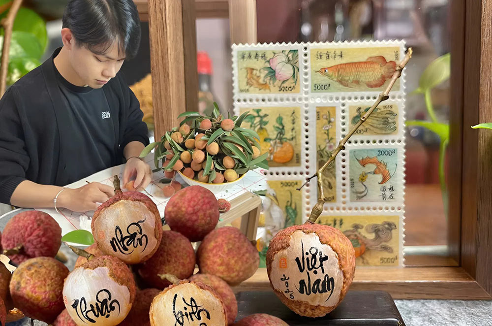 종이에 서예를 쓰는 대신 'ba lua,'를 선택한 하노이 출신 28세의 쩌우 비엣 웃 씨는 리치에 '붓 춤'을 선택했습니다. 그의 공들인 작품은 온라인 커뮤니티를 감탄하게 만들었습니다.