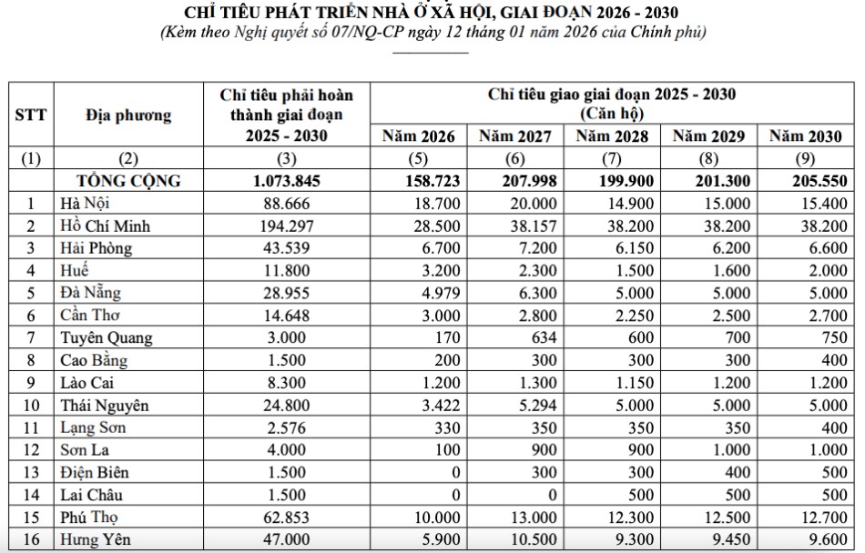 정부는 2026-2030년 기간 동안 지방에 사회 주택(NOXH) 개발 목표를 할당하는 것에 관한 2026년 1월 12일자 결의안 7/NQ-CP를 방금 발표했습니다.
