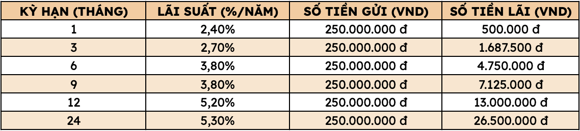 따라서 아그리뱅크에 2억 5천만 동을 예금하면 고객은 다음과 같이 가장 높은 이자를 받을 수 있습니다(매점에서 직접 예금하는 개인 고객에게 적용).