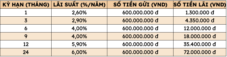 따라서 아그리뱅크에 6억 동을 예금하면 고객은 다음과 같이 가장 높은 이자를 받을 수 있습니다(개인 고객이 창구에서 직접 예금하는 경우 적용).