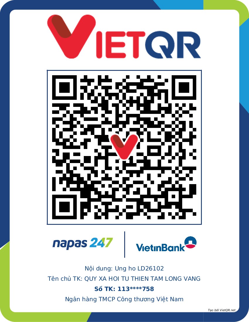 LD26102의 삶에 대한 모든 도움은 하노이 호안끼엠군 항보 51번지 황금 마음 자선 사회 기금으로 보내주십시오. 계좌 번호 (STK) 113000000758은 하노이 호안끼엠 지점 Vietinbank에 있습니다. STK: 0021000303088 - 하노이 지점 Vietcombank에 있습니다. STK: 12410001122556 - 호안끼엠 지점 BIDV에 있습니다.