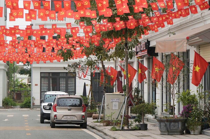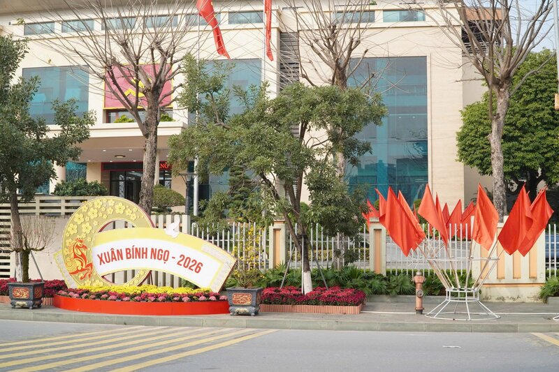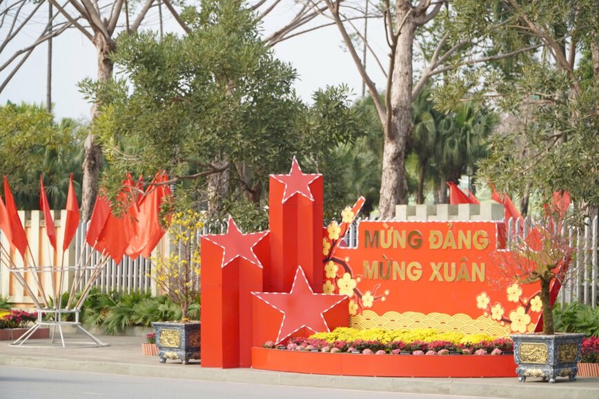 공공 공간, 주요 거리, 기관 본부, 당과 봄을 기념하는 많은 상징물 클러스터, 장식 클러스터, 깃발, 휘장, 꽃, 파노, 포스터, 생화 등은 빨간색과 노란색의 두 가지 주요 색상으로 장식되어 화려한 도시 그림을 만들어냅니다.