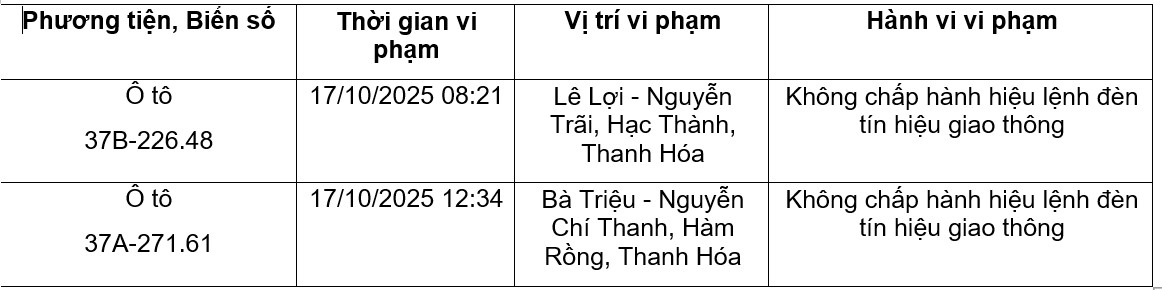 탄호아 공안은 또한 보안 및 질서 감시 카메라 시스템 교통 안전 카메라(2025년 10월 11일부터 2025년 10월 20일까지)를 통해 교통 안전 및 질서 위반 차량을 발견한 결과 이 중 응에안 번호판 차량은 다음과 같다고 밝혔습니다.