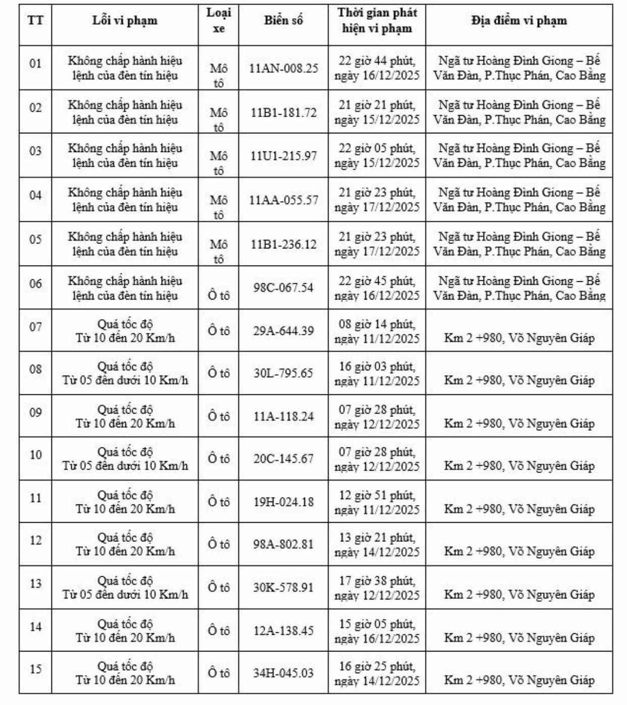 까오방성 공안의 통지에 따르면 규정 속도 초과 운전과 같은 위반 사항을 저지른 자동차 및 오토바이 운전 사례가 Vo Nguyen Giap 도로 Km2+980에서 발견되었고 Hoang Dinh Giong - Be Van Dan 교차로에서 신호 위반이 발견되었습니다...
