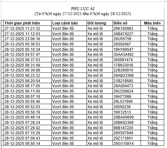 교통 경찰국은 2025년 12월 27일부터 2025년 12월 28일까지 하노이 시내(팜반박 - 호앙찌 교차로)에 시범적으로 설치된 A.I 카메라의 데이터를 추출하여 신호등 - 적색 신호 위반 명령을 따르지 않는 많은 사례를 자동으로 발견했다고 밝혔습니다. 목록은 다음과 같습니다.