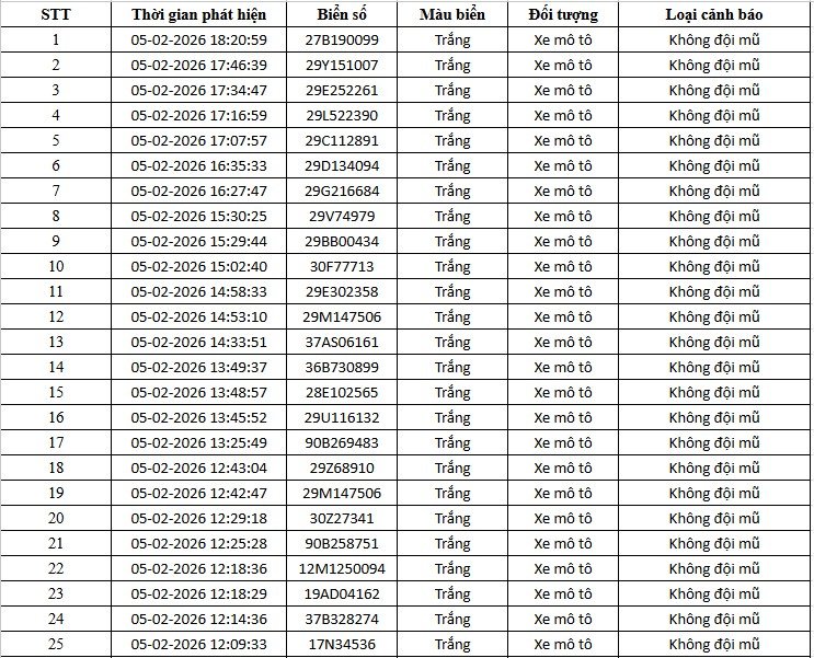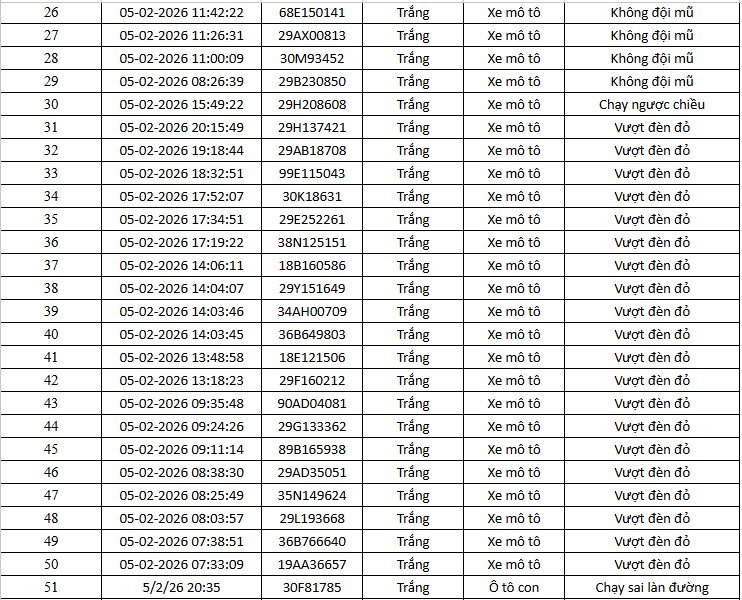 공안부 교통 경찰국(CSGT)의 정보에 따르면, 2026년 2월 5일 12시부터 2월 6일 12시까지 이 부서가 운영하는 인공 지능(AI) 응용 카메라 시스템은 하노이와 노이바이-라오까이 고속도로에서 많은 교통 질서 및 안전 위반 사례를 기록했습니다.
