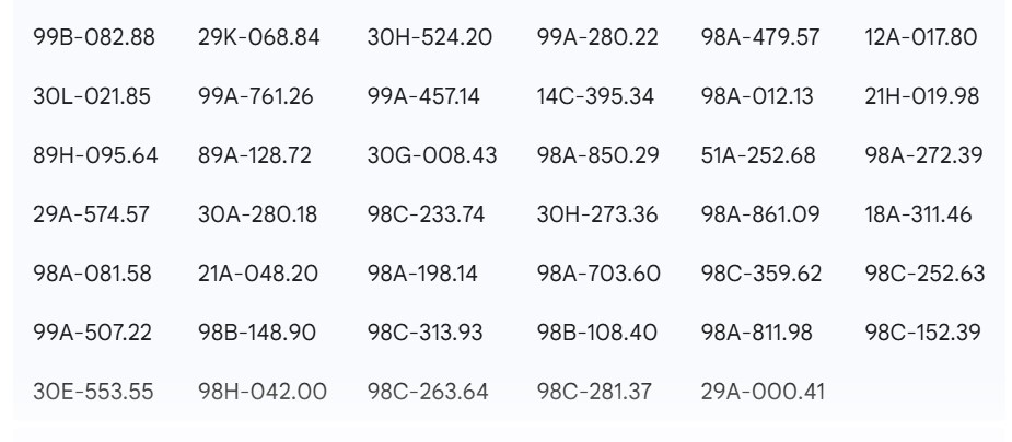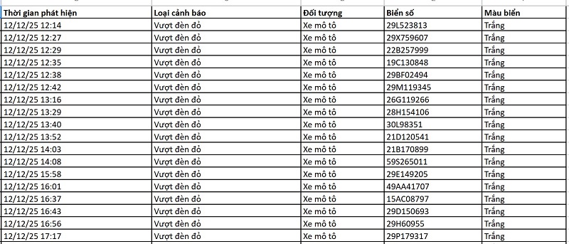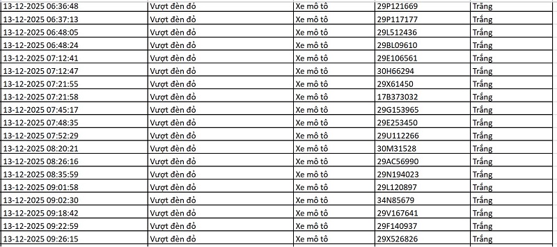교통 경찰국은 2025년 12월 12일 12시부터 2025년 12월 13일 12시까지 하노이 도심에 시범 설치된 A.I 카메라(Pham Van Bach - Hoang Quan Chi 3: 교차로)에서 데이터를 추출한 결과 신호등 명령 불이행 - 빨간불 위반(전체 오토바이) 사례가 자동으로 발견되었다고 밝혔습니다. 목록은 다음과 같습니다.