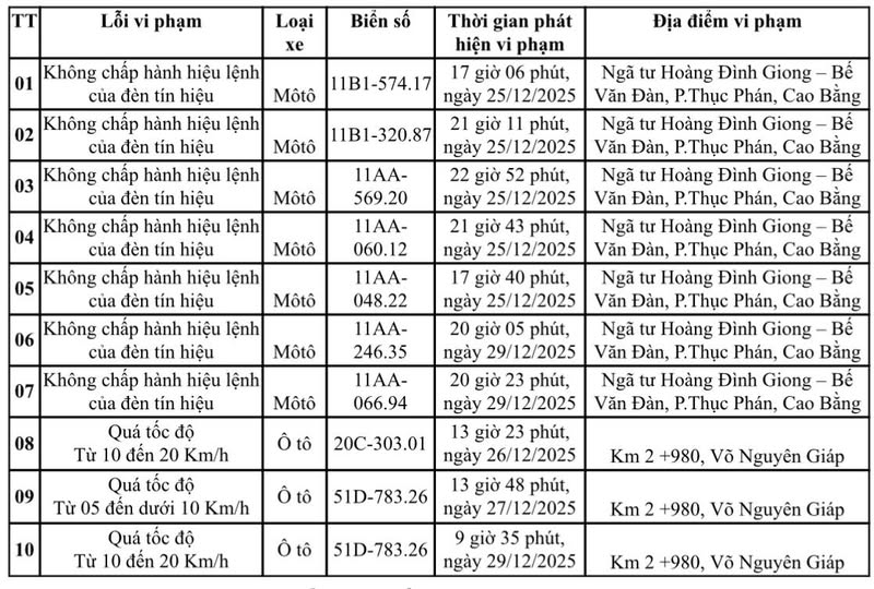 까오방성 공안의 통지에 따르면 자동차 및 오토바이 운전자가 규정 속도 초과, Km2+980, 보응우옌잡 도로에서 적색 신호 위반, 호앙딘지옹 - 베반단 교차로에서 적색 신호 위반 등과 같은 위반 사항을 저지른 사례가 발견되었습니다.
