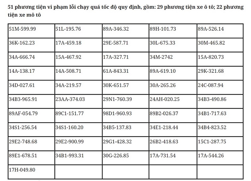 흥옌성 공안 교통 경찰국은 2월 9일부터 2월 22일까지 2주 동안 감시 카메라 시스템을 활용하고 전문 장비를 사용하여 교통 경찰이 51건의 과속 사례를 기록했다고 밝혔습니다. 목록은 다음과 같습니다.
