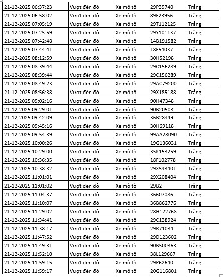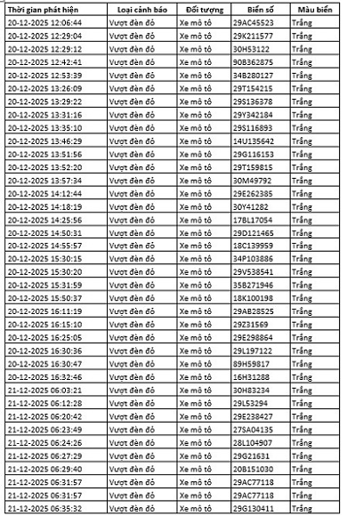 12월 22일 교통 경찰국은 2025년 12월 20일 12시부터 2025년 12월 21일 12시까지 하노이 도심에 시범 설치된 A.I 카메라(Pham Van Bach - Hoang Quan Chi Body 교차로)에서 데이터를 추출한 결과 신호등 명령 불이행 - 빨간불 위반 사례가 다수 자동으로 발견되었다고 밝혔습니다. 목록은 다음과 같습니다.