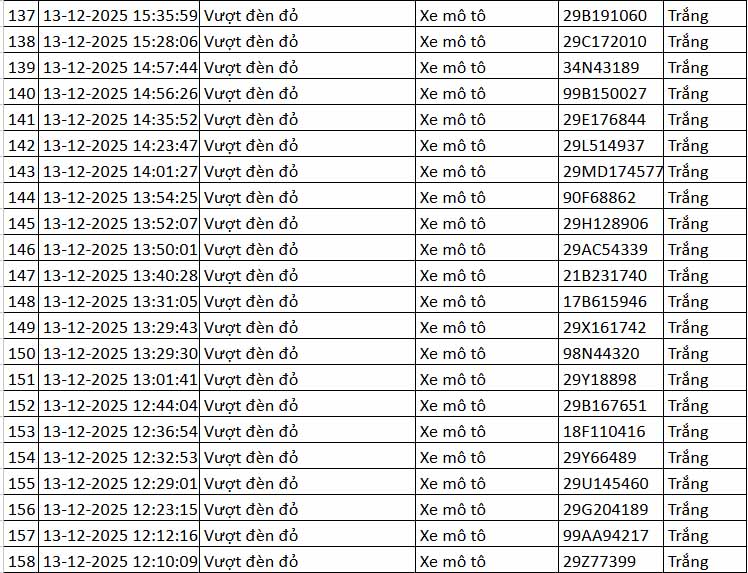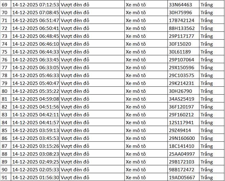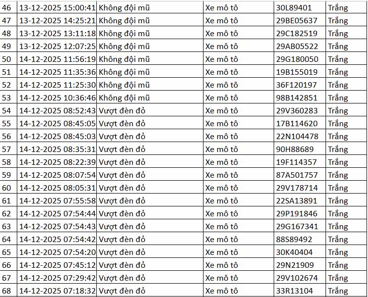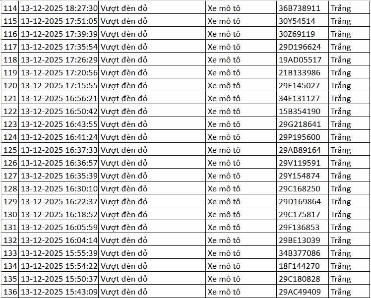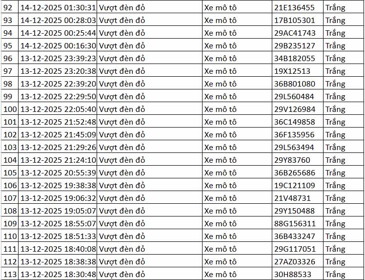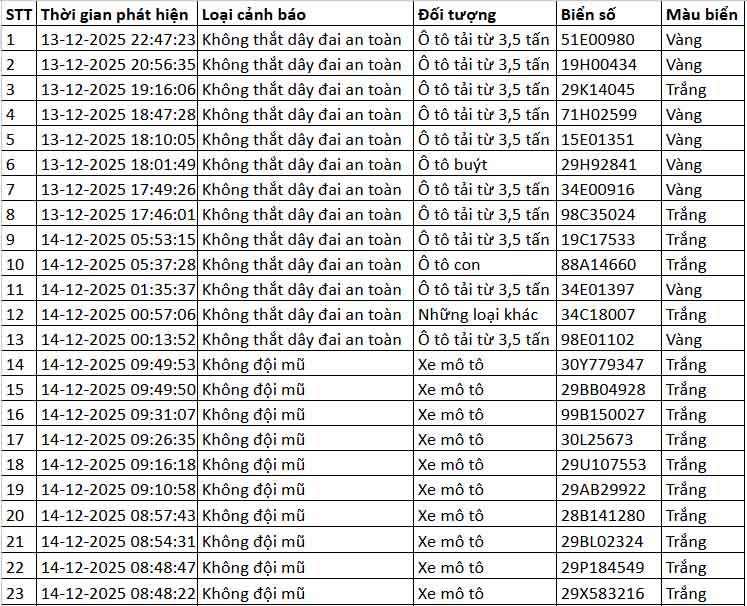 공안부 교통 경찰국(CSGT)의 정보에 따르면 2025년 12월 13일 12시부터 2025년 12월 14일 12시까지 교통 경찰국이 운영하는 인공 지능(AI)을 적용한 카메라 시스템은 노이바이-라오까이 고속도로 및 하노이 도심 지역에서 많은 교통 안전 질서 위반 행위를 기록하고 발견했습니다.